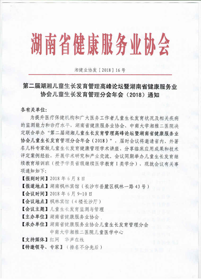 第二届湖湘儿童生长发育管理高峰论坛暨湖南省健康服务业协会儿童生长发育管理分会年会(2018)通知