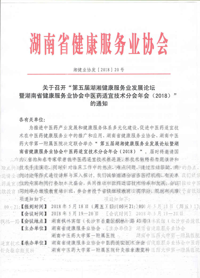 下一篇:关于召开“第五届湖湘健康服务业发展论坛暨湖南省健康服务业协会中医药健康管理分会年会(2018)”的通知