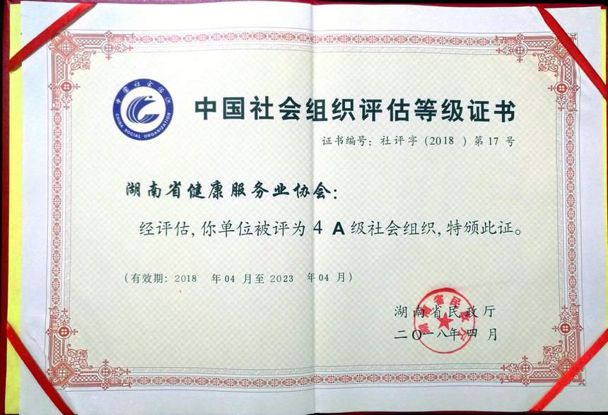 2018年4月4日,湖南省健康服务业协会顺利通过湖南省民政厅组织开展的社会组织等级评估,并被省民政厅授予《湖南省社会组织评估AAAA等级证书》及《湖南省社会组织评估等级AAAA》铭牌。