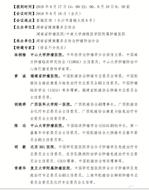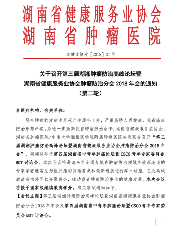 关于召开第三届湖湘肿瘤防治高峰论坛暨湖南省健康服务业协会肿瘤防治分会2018年会的通知