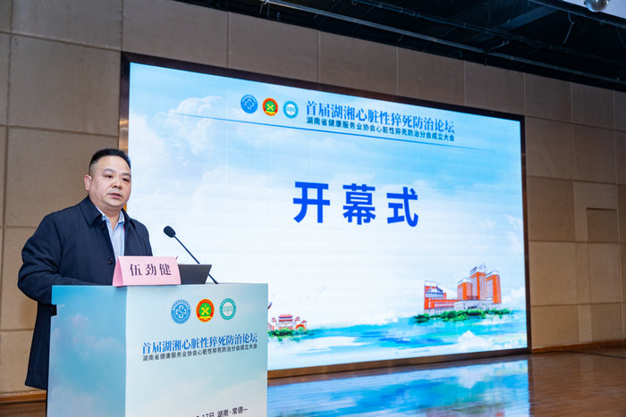 17日上午,成立大会开幕式由湖南省健康服务业协会副理事长兼秘书长伍劲健先生主持,湖南省健康服务业协会理事长李桂源教授出席并讲话。中南大学湘雅医院原副院长、中南大学湘雅三医院原院长张国刚教授,常德市第一人民医院党委书记向勇志教授,中国医学科学院阜外医院张澍教授,中山大学孙逸仙纪念医院王景峰教授分别向会议致辞,湖南省健康服务业协会心脏性猝死防治分会理事长、中南大学湘雅医院石瑞正教授报告分会筹备情况。